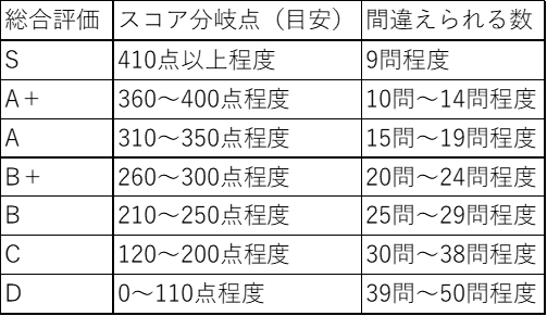 図1は1問10点換算から、各評価を取るために間違えても良い数を導いています。皆さんは各自の目標評価を取るのにどれくらい正解すれば良いかの目安にしてください。また、勝手な予想ですが各問の選択肢は4つあるため、ランダムに選べば1/4で正解し、50問あるため、12.5問は確率上当たります。12問だとすると、C評価は取れることになります。勉強して受験する方はB以上は取っておきたいですね。